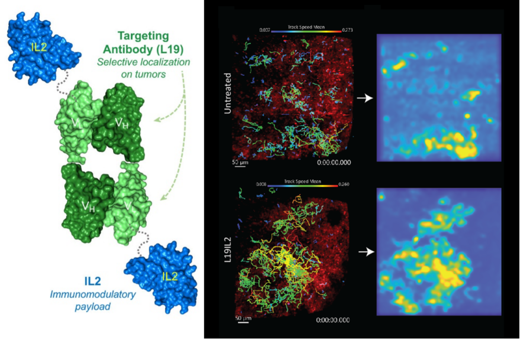 B cell lymphoma is a common blood cancer affecting thousands of people worldwide each year. While standard approaches such as R-CHOP chemoimmunotherapy and cellular therapies have improved the outcome of the disease, many patients still relapse or develop therapy resistance. In this study, we characterized the mechanism of action of L19IL2, a novel therapeutic strategy designed to selectively activate the immune response in the areas surrounding the tumor. L19IL2, is formed by a fusion between an antibody (L19) that specifically recognizes an antigen expressed in the tumor environment, and interleukin-2 (IL2), a powerful inflammatory cytokine. By delivering IL2 directly to the lymphoma site, this approach aims to activate antitumoral immune cells exactly and only where they are needed, while limiting unwanted off-target effects. Using a preclinical murine model of B cell lymphoma, we found that targeted IL2 delivery significantly slows tumor growth. Importantly, we discovered that this treatment enhances the activity and motility of CD8⁺ T cells, allowing them to better navigate the tumor and to eliminate cancer cells. These findings provide new insight into how precise immune stimulation can improve anti-lymphoma responses and support further clinical development of this strategy for patients with aggressive diseases. This Innosuisse funded project was carried out in collaboration with the Junqueira’s and Sallusto’s lab at the IRB and the biotech company Philochem.